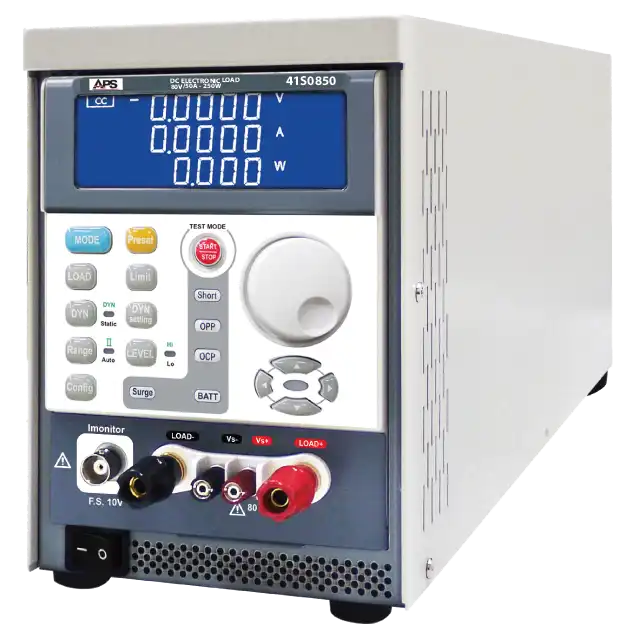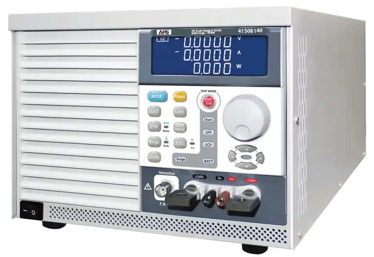 APS 41S Series DC loads support low-voltage/high-current or high-voltage/low-current operation, with fast programmable slew rates for power supply evaluation, OCP/OPP and dynamic CC modes for design verification, programmable battery discharge profiles, and automated protection device testing.
