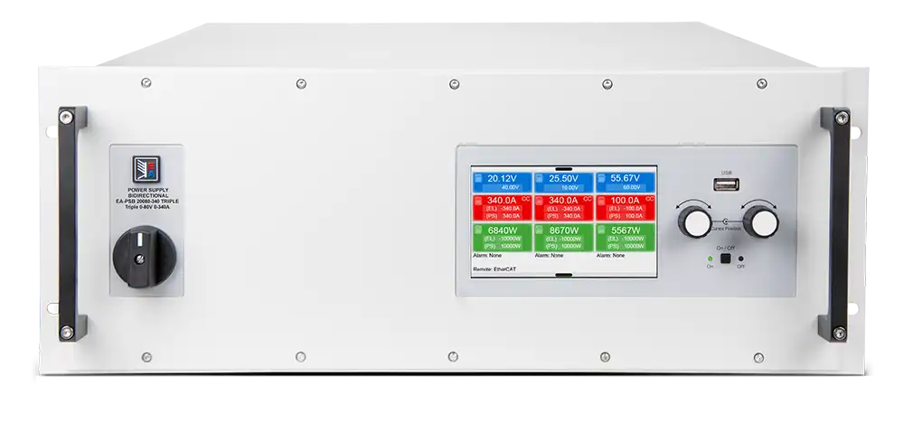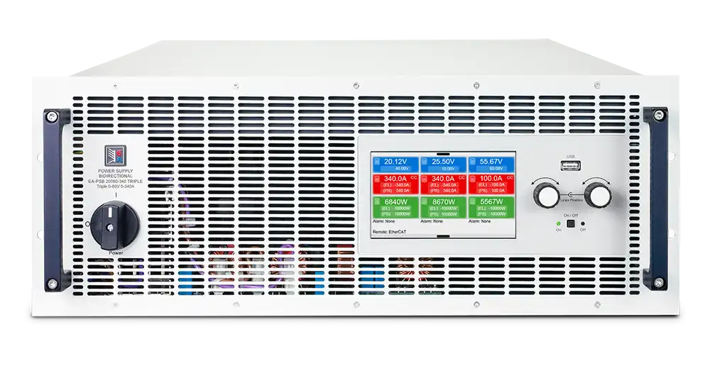 The EA PSB 20000 and 10000 Series bidirectional DC power supplies combine high efficiency, precision, and versatility. Regenerative operation returns energy to the grid at over 96% efficiency, reducing heat and noise. True autoranging maximizes power across wide voltage and current ranges, while control interfaces enable seamless integration. The 20000 Series adds three channels, 1 ms response, safety sense, a function generator, and preloaded routines for battery, fuel cell, and PV simulation.
