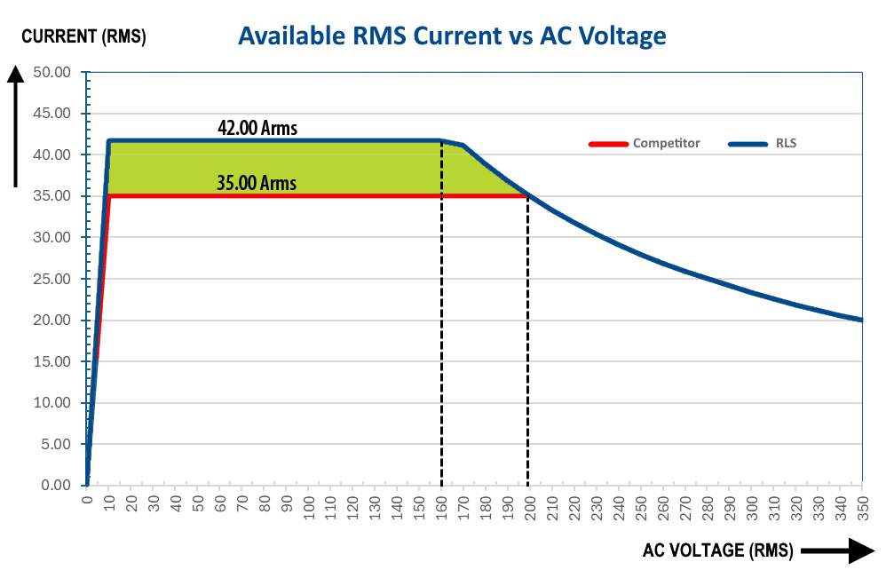 The RLS Regenerative Load Simulator provides a broader range of current eliminating the risk of over or under sizing the power source. This reduces the need for additional capital investment. The diagram to the right illustrates the RLS’s capability to provide 20% more current from 120V to 200V when compared to a typical unit that maxes out at 35A/phase.